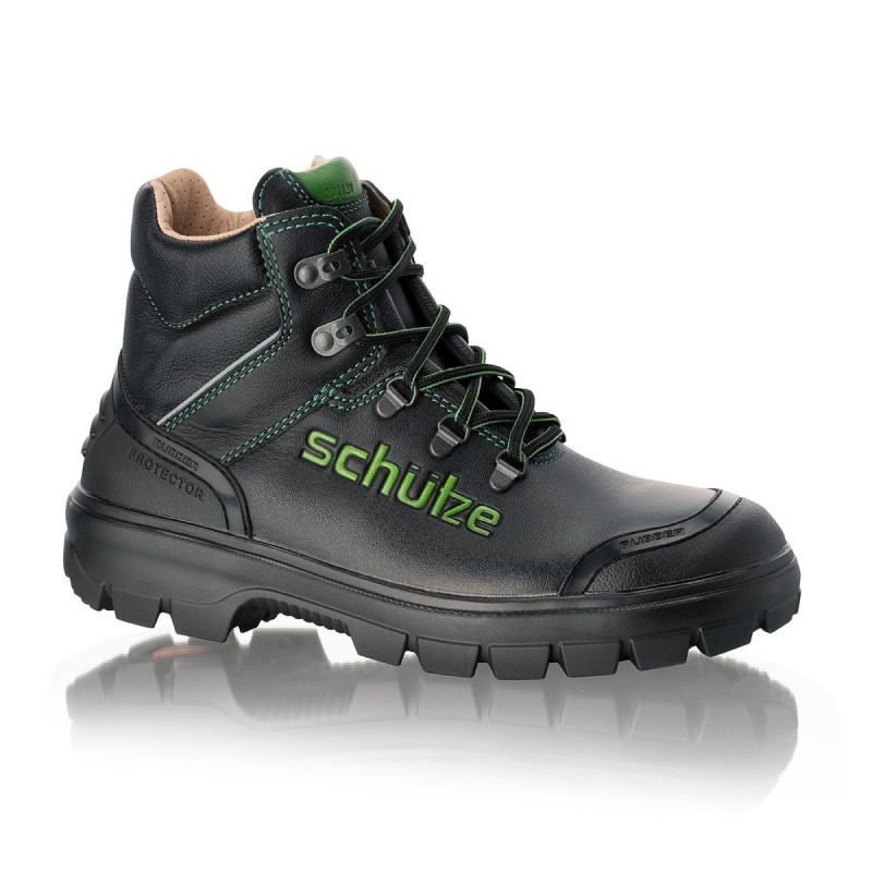 The SCHÜTZE BAUPROFI is built for demanding construction work, combining waterproof leather (up to 4 hours), a robust build, and high durability. Its DUO-SOFT-AKTIV sole offers SRC slip resistance, heat and cold insulation, and contact heat resistance up to 300 °C. A steel toe cap and stainless steel midsole provide reliable protection. Inside, a breathable orthopaedic leather lining and moisture-regulating, replaceable insole ensure all-day comfort. Reinforced toe and heel protect against abrasion—making it a top choice for construction professionals. Full natural leather, inside and out.