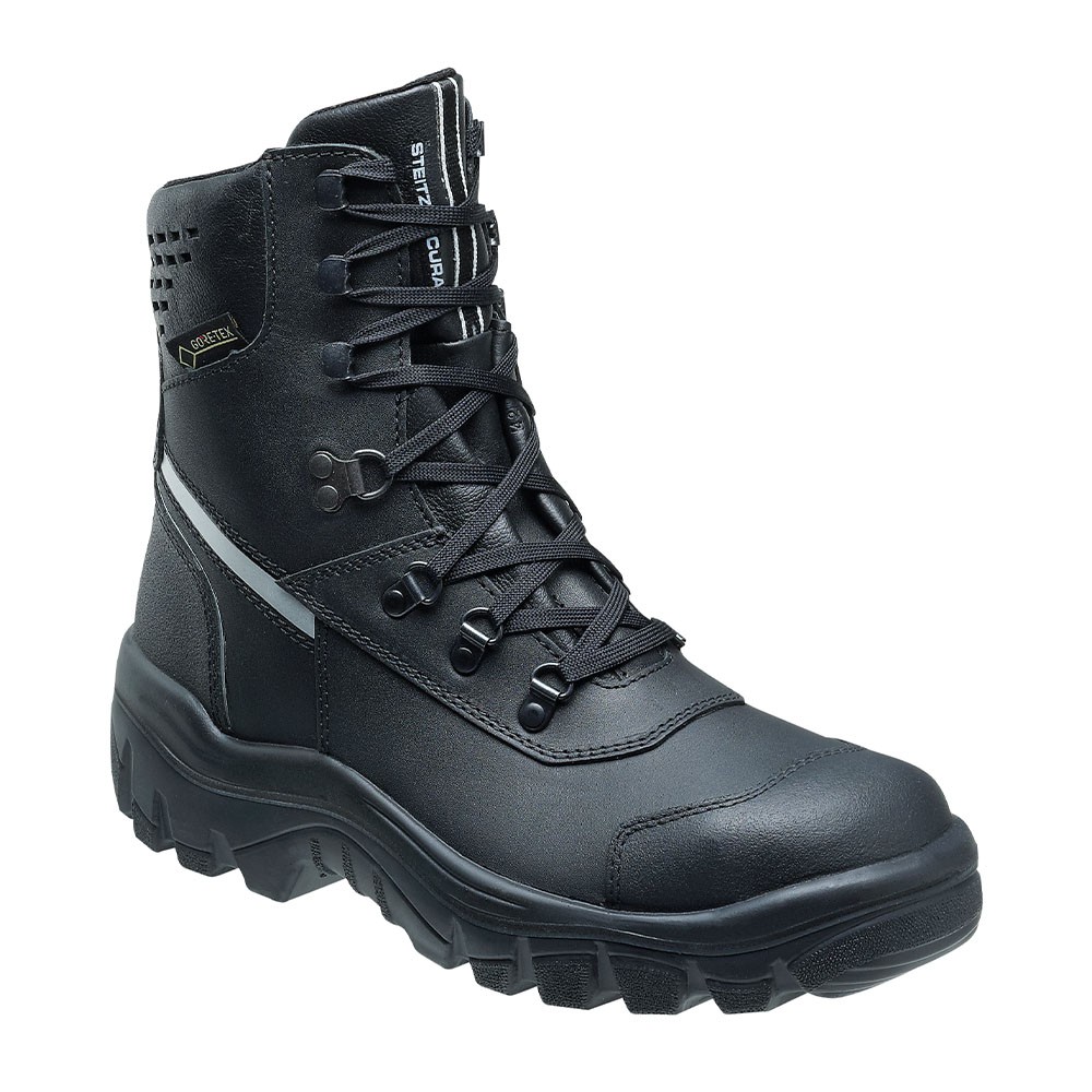 Stavanger V GTX S3 is a rugged safety boot with EN ISO 20345:2011 S3 SRC CI HRO HI certification. It features a GORE-TEX® membrane for waterproof breathability, hydrophobic leather, a dust-guard tongue, and safety reflectors. SECURA VARIO® heel cushioning, a steel toe cap, metatarsal protection, and a steel midsole offer ergonomic safety and ESD protection.